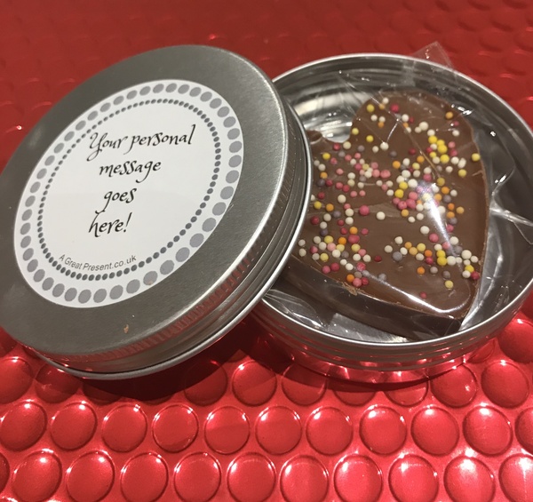 A great tasting belgian chocolate chunky heart in a wonderful presentation tin which can be personalised if required.
